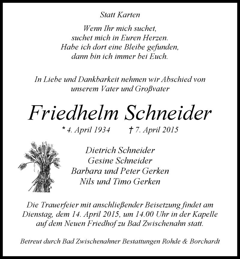 Hier finden Sie alle Traueranzeigen aus der Zeitung, die bisher für Friedhelm Schneider erschienen sind. Weitere Traueranzeigen, die in der Zeitung erscheinen, werden hier ebenfalls aufgelistet