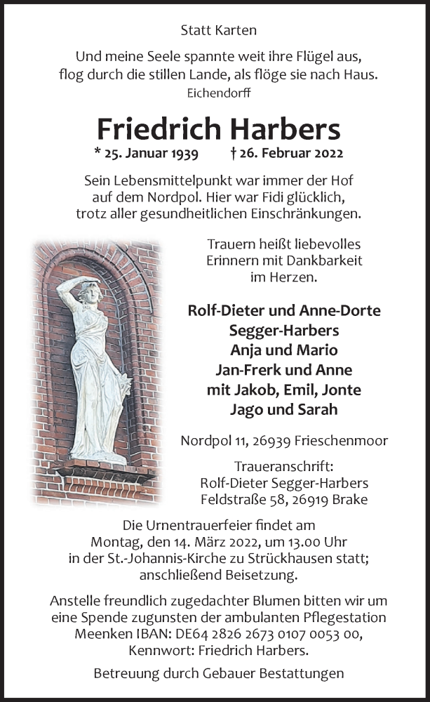 Hier finden Sie alle Traueranzeigen aus der Zeitung, die bisher für Friedrich Harbers erschienen sind. Weitere Traueranzeigen, die in der Zeitung erscheinen, werden hier ebenfalls aufgelistet