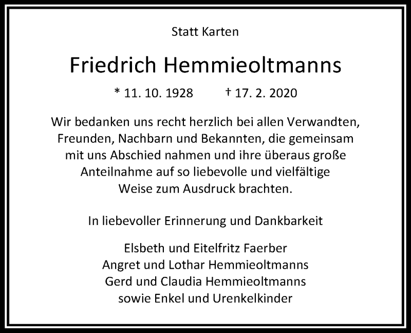 Hier finden Sie alle Traueranzeigen aus der Zeitung, die bisher für Friedrich Hemmieoltmanns erschienen sind. Weitere Traueranzeigen, die in der Zeitung erscheinen, werden hier ebenfalls aufgelistet