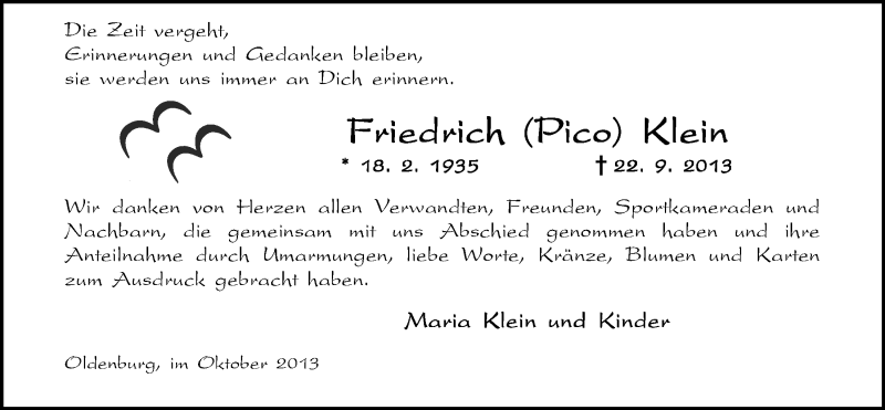 Hier finden Sie alle Traueranzeigen aus der Zeitung, die bisher für Friedrich Klein erschienen sind. Weitere Traueranzeigen, die in der Zeitung erscheinen, werden hier ebenfalls aufgelistet
