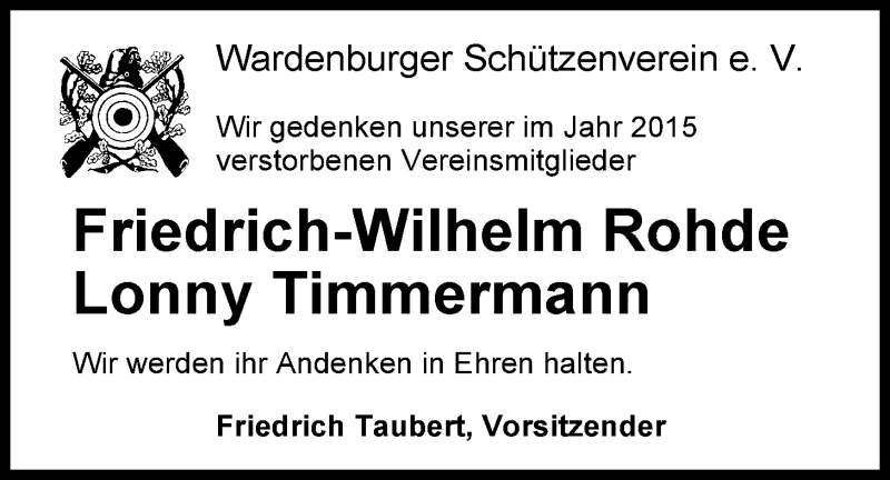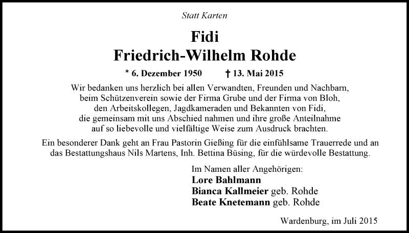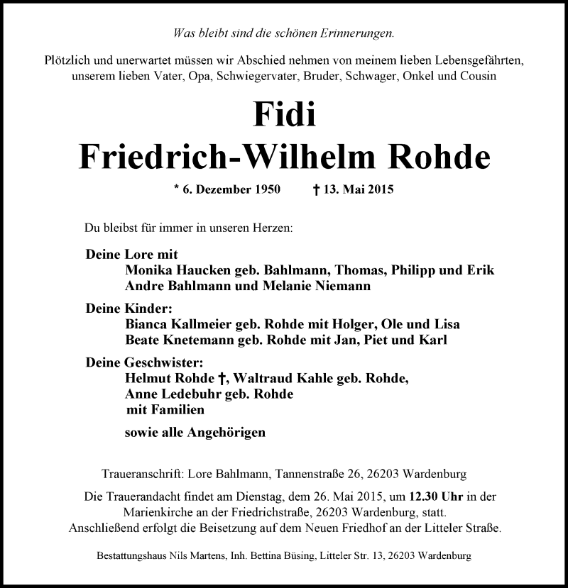 Hier finden Sie alle Traueranzeigen aus der Zeitung, die bisher für Friedrich-Wilhelm Rohde erschienen sind. Weitere Traueranzeigen, die in der Zeitung erscheinen, werden hier ebenfalls aufgelistet