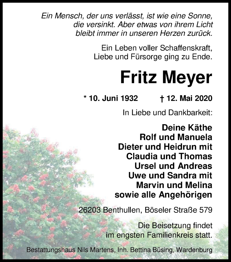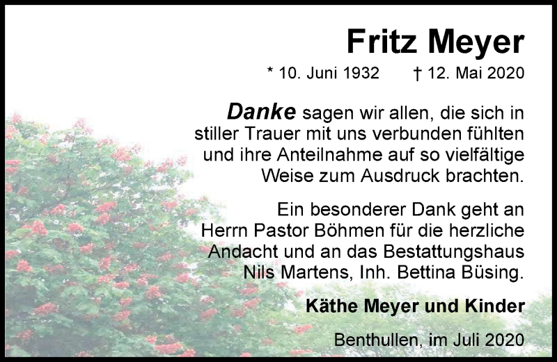 Hier finden Sie alle Traueranzeigen aus der Zeitung, die bisher für Fritz Meyer erschienen sind. Weitere Traueranzeigen, die in der Zeitung erscheinen, werden hier ebenfalls aufgelistet
