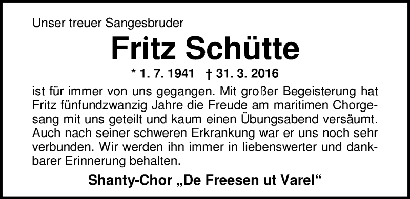 Hier finden Sie alle Traueranzeigen aus der Zeitung, die bisher für Fritz Schütte erschienen sind. Weitere Traueranzeigen, die in der Zeitung erscheinen, werden hier ebenfalls aufgelistet