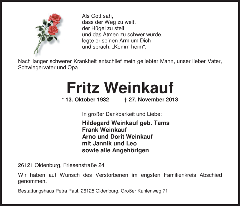 Hier finden Sie alle Traueranzeigen aus der Zeitung, die bisher für Fritz Weinkauf erschienen sind. Weitere Traueranzeigen, die in der Zeitung erscheinen, werden hier ebenfalls aufgelistet