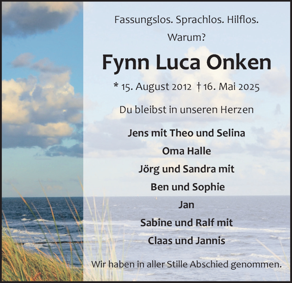 Hier finden Sie alle Traueranzeigen aus der Zeitung, die bisher für Fynn Luca Onken erschienen sind. Weitere Traueranzeigen, die in der Zeitung erscheinen, werden hier ebenfalls aufgelistet