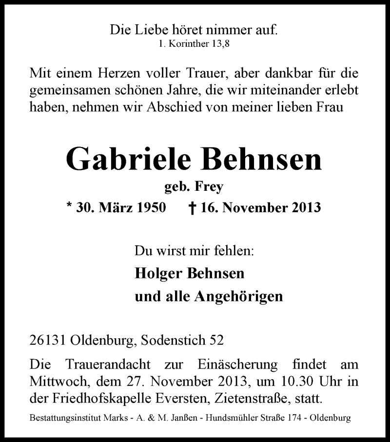 Hier finden Sie alle Traueranzeigen aus der Zeitung, die bisher für Gabriele Behnsen erschienen sind. Weitere Traueranzeigen, die in der Zeitung erscheinen, werden hier ebenfalls aufgelistet