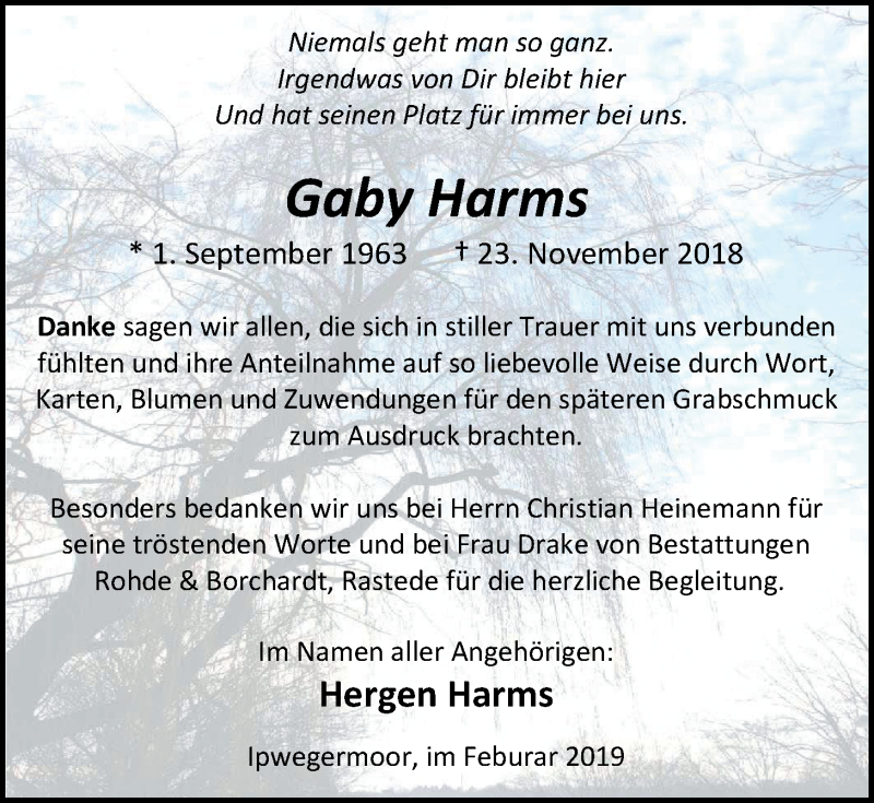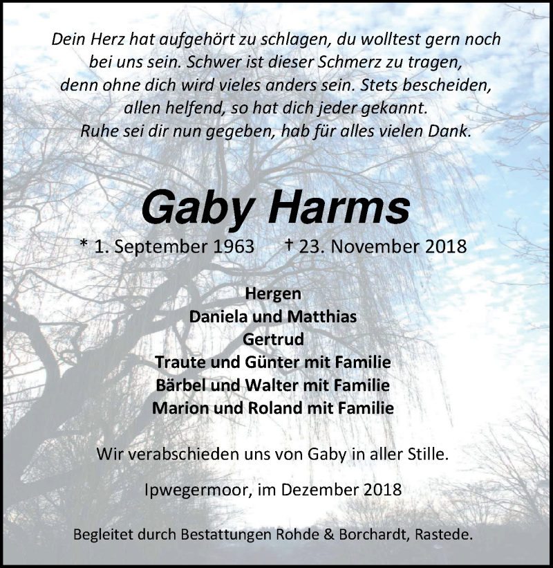 Hier finden Sie alle Traueranzeigen aus der Zeitung, die bisher für Gaby Harms erschienen sind. Weitere Traueranzeigen, die in der Zeitung erscheinen, werden hier ebenfalls aufgelistet