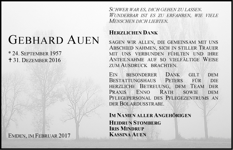 Hier finden Sie alle Traueranzeigen aus der Zeitung, die bisher für Gebhard Auen erschienen sind. Weitere Traueranzeigen, die in der Zeitung erscheinen, werden hier ebenfalls aufgelistet