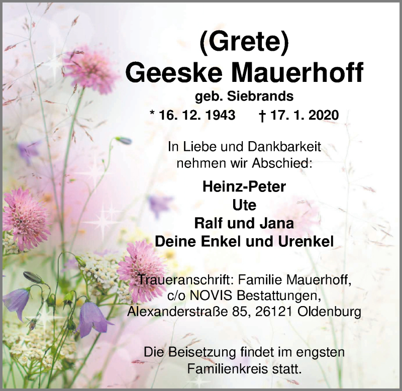 Hier finden Sie alle Traueranzeigen aus der Zeitung, die bisher für Geeske Mauerhoff erschienen sind. Weitere Traueranzeigen, die in der Zeitung erscheinen, werden hier ebenfalls aufgelistet