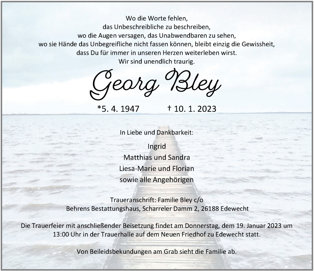 Hier finden Sie alle Traueranzeigen aus der Zeitung, die bisher für Georg Bley erschienen sind. Weitere Traueranzeigen, die in der Zeitung erscheinen, werden hier ebenfalls aufgelistet