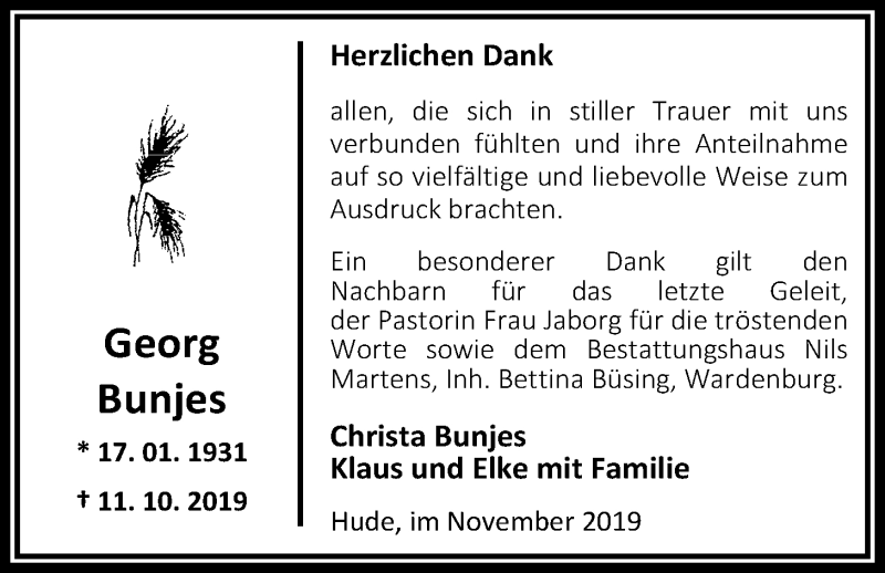 Hier finden Sie alle Traueranzeigen aus der Zeitung, die bisher für Georg Bunjes erschienen sind. Weitere Traueranzeigen, die in der Zeitung erscheinen, werden hier ebenfalls aufgelistet