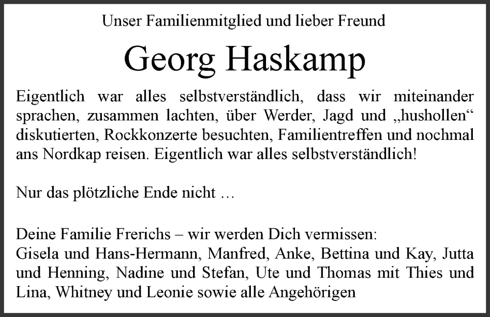 Hier finden Sie alle Traueranzeigen aus der Zeitung, die bisher für Georg Haskamp erschienen sind. Weitere Traueranzeigen, die in der Zeitung erscheinen, werden hier ebenfalls aufgelistet