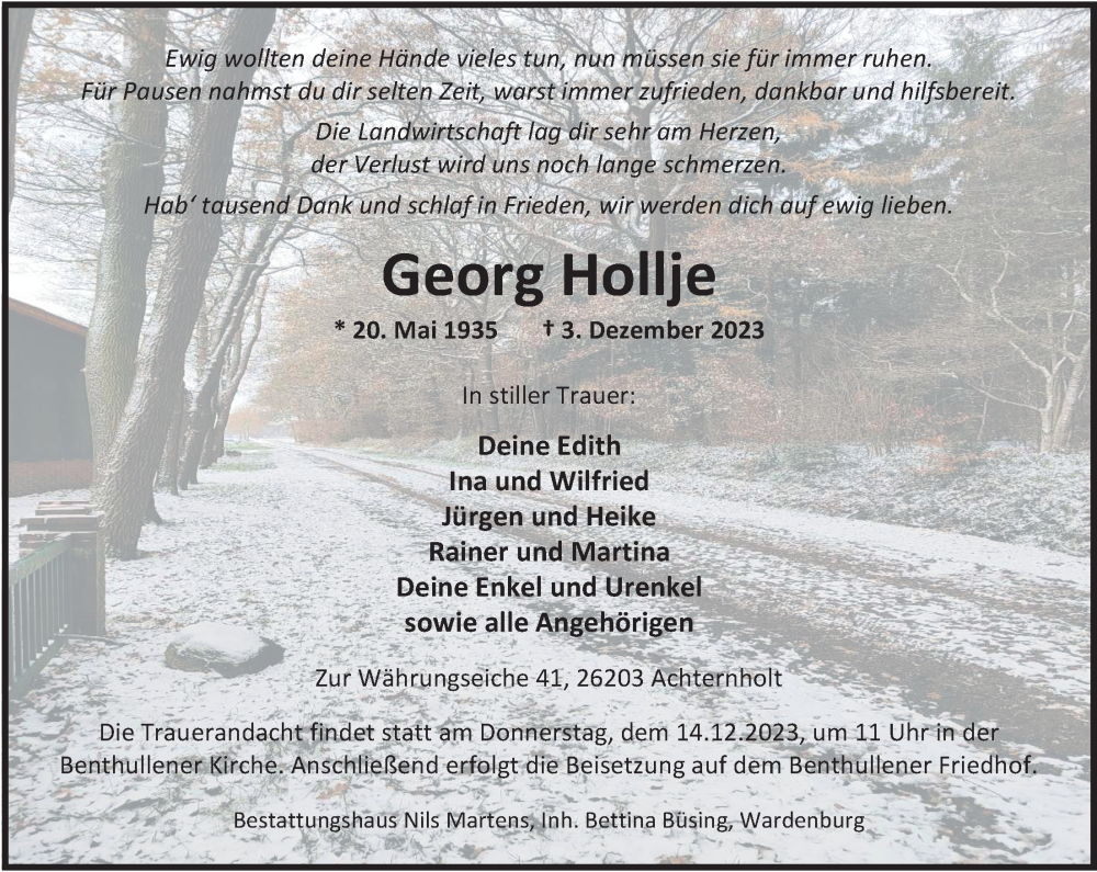 Hier finden Sie alle Traueranzeigen aus der Zeitung, die bisher für Georg Hollje erschienen sind. Weitere Traueranzeigen, die in der Zeitung erscheinen, werden hier ebenfalls aufgelistet