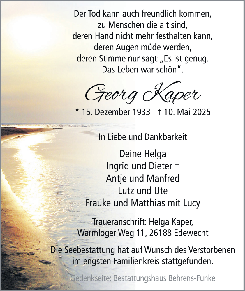 Hier finden Sie alle Traueranzeigen aus der Zeitung, die bisher für Georg Kaper erschienen sind. Weitere Traueranzeigen, die in der Zeitung erscheinen, werden hier ebenfalls aufgelistet