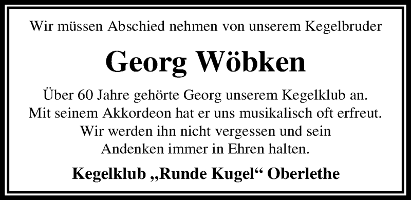 Hier finden Sie alle Traueranzeigen aus der Zeitung, die bisher für Georg Wöbken erschienen sind. Weitere Traueranzeigen, die in der Zeitung erscheinen, werden hier ebenfalls aufgelistet