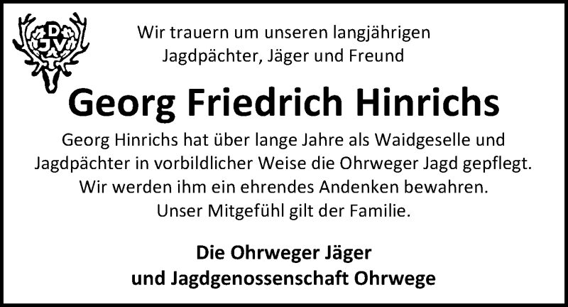 Hier finden Sie alle Traueranzeigen aus der Zeitung, die bisher für Georg Friedrich Hinrichs erschienen sind. Weitere Traueranzeigen, die in der Zeitung erscheinen, werden hier ebenfalls aufgelistet