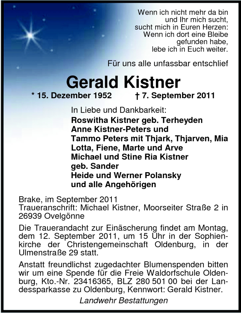 Hier finden Sie alle Traueranzeigen aus der Zeitung, die bisher für Gerald Kistner erschienen sind. Weitere Traueranzeigen, die in der Zeitung erscheinen, werden hier ebenfalls aufgelistet