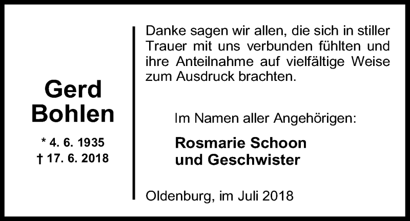 Hier finden Sie alle Traueranzeigen aus der Zeitung, die bisher für Gerd Bohlen erschienen sind. Weitere Traueranzeigen, die in der Zeitung erscheinen, werden hier ebenfalls aufgelistet