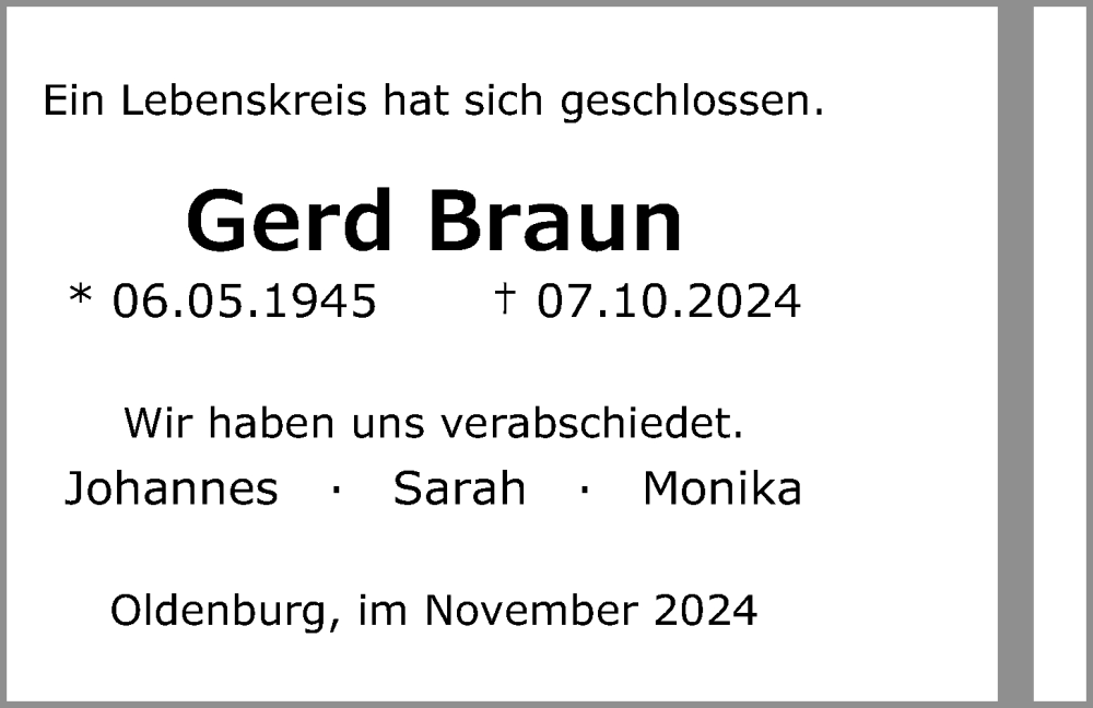 Hier finden Sie alle Traueranzeigen aus der Zeitung, die bisher für Gerd Braun erschienen sind. Weitere Traueranzeigen, die in der Zeitung erscheinen, werden hier ebenfalls aufgelistet