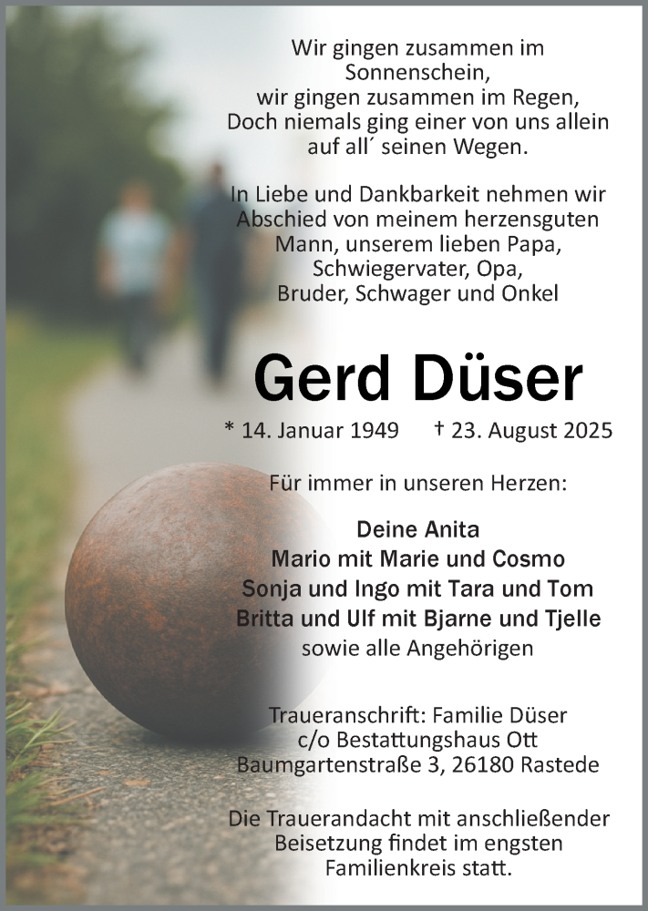 Hier finden Sie alle Traueranzeigen aus der Zeitung, die bisher für Gerd Düser erschienen sind. Weitere Traueranzeigen, die in der Zeitung erscheinen, werden hier ebenfalls aufgelistet