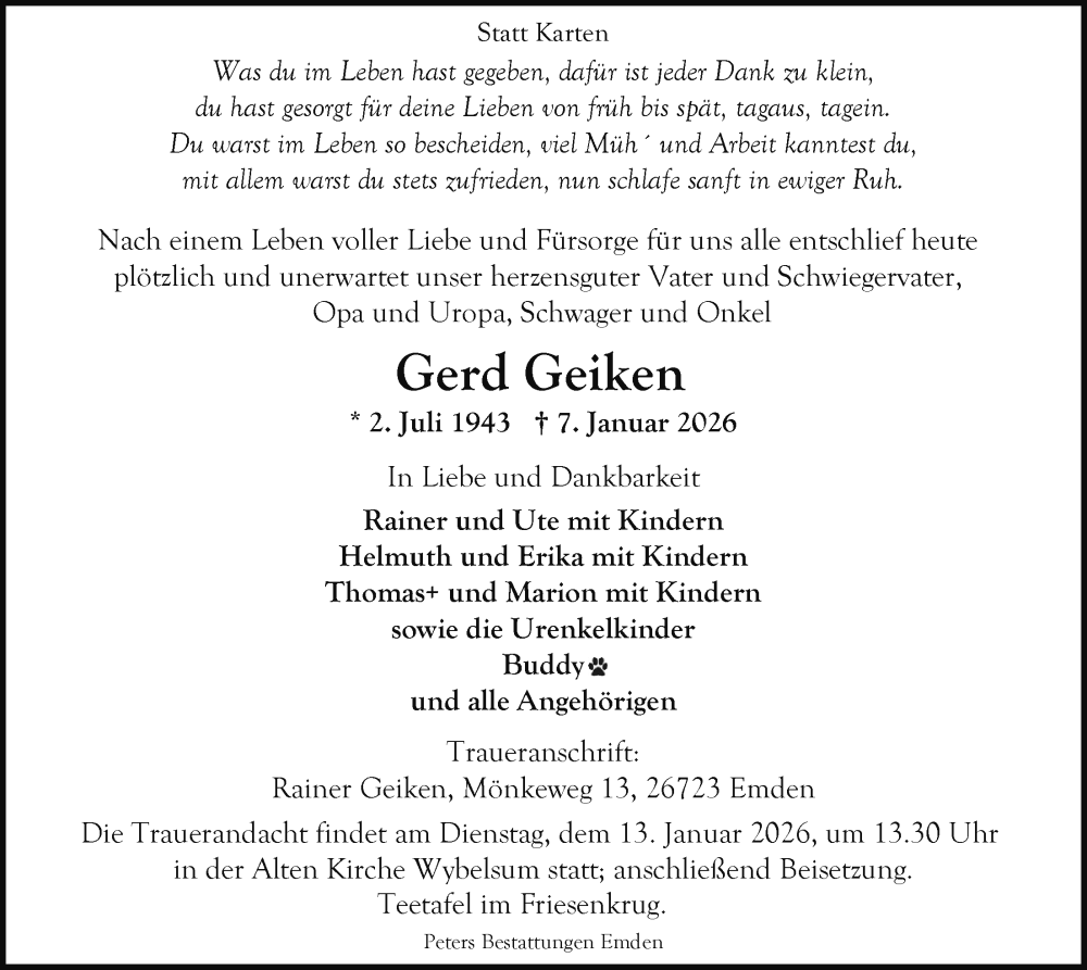Hier finden Sie alle Traueranzeigen aus der Zeitung, die bisher für Gerd Geiken erschienen sind. Weitere Traueranzeigen, die in der Zeitung erscheinen, werden hier ebenfalls aufgelistet