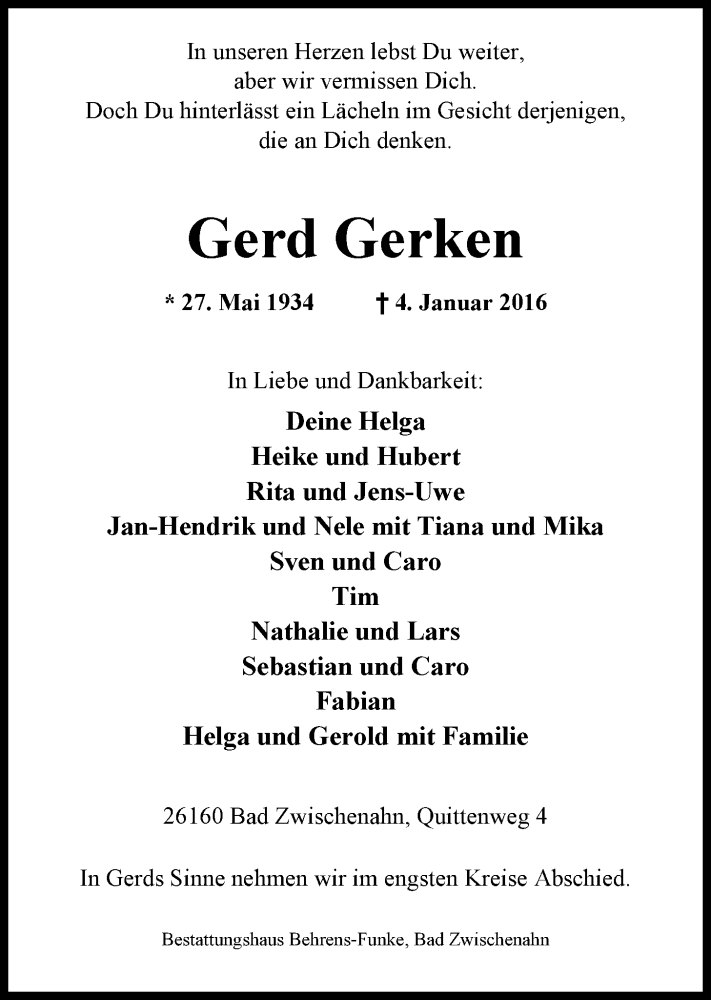 Hier finden Sie alle Traueranzeigen aus der Zeitung, die bisher für Gerd Gerken erschienen sind. Weitere Traueranzeigen, die in der Zeitung erscheinen, werden hier ebenfalls aufgelistet