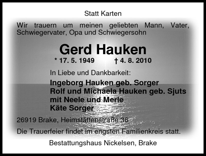 Hier finden Sie alle Traueranzeigen aus der Zeitung, die bisher für Gerd Hauken erschienen sind. Weitere Traueranzeigen, die in der Zeitung erscheinen, werden hier ebenfalls aufgelistet