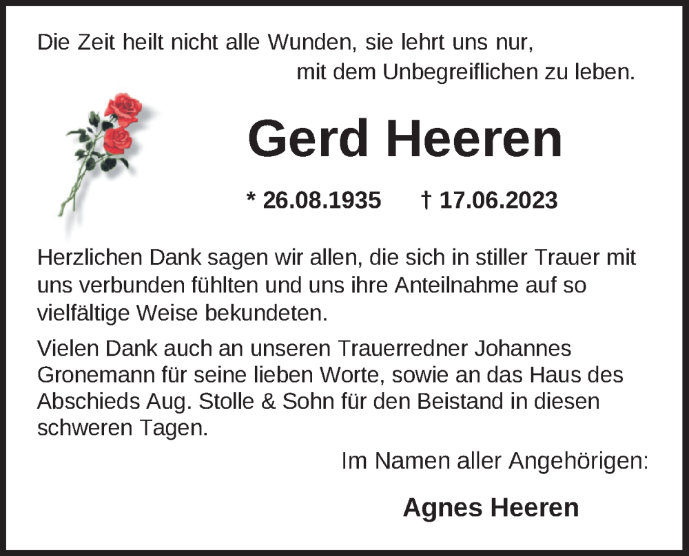 Hier finden Sie alle Traueranzeigen aus der Zeitung, die bisher für Gerd Heeren erschienen sind. Weitere Traueranzeigen, die in der Zeitung erscheinen, werden hier ebenfalls aufgelistet