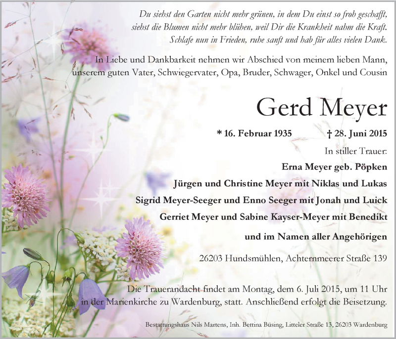 Hier finden Sie alle Traueranzeigen aus der Zeitung, die bisher für Gerd Meyer erschienen sind. Weitere Traueranzeigen, die in der Zeitung erscheinen, werden hier ebenfalls aufgelistet