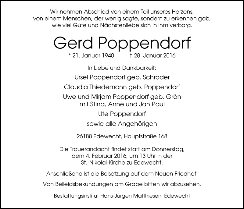 Hier finden Sie alle Traueranzeigen aus der Zeitung, die bisher für Gerd Poppendorf erschienen sind. Weitere Traueranzeigen, die in der Zeitung erscheinen, werden hier ebenfalls aufgelistet