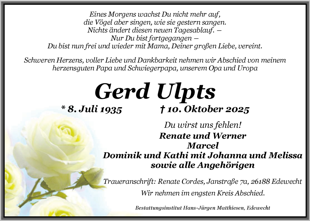 Hier finden Sie alle Traueranzeigen aus der Zeitung, die bisher für Gerd Ulpts erschienen sind. Weitere Traueranzeigen, die in der Zeitung erscheinen, werden hier ebenfalls aufgelistet