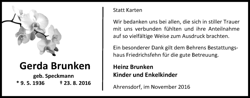 Hier finden Sie alle Traueranzeigen aus der Zeitung, die bisher für Gerda Brunken erschienen sind. Weitere Traueranzeigen, die in der Zeitung erscheinen, werden hier ebenfalls aufgelistet