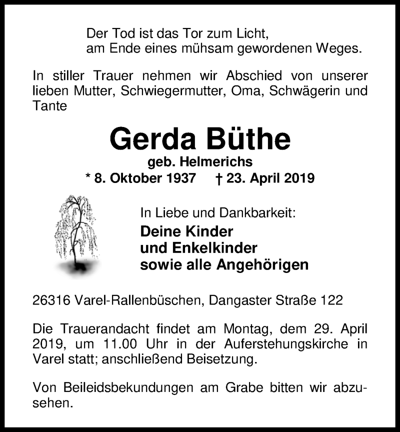 Hier finden Sie alle Traueranzeigen aus der Zeitung, die bisher für Gerda Büthe erschienen sind. Weitere Traueranzeigen, die in der Zeitung erscheinen, werden hier ebenfalls aufgelistet