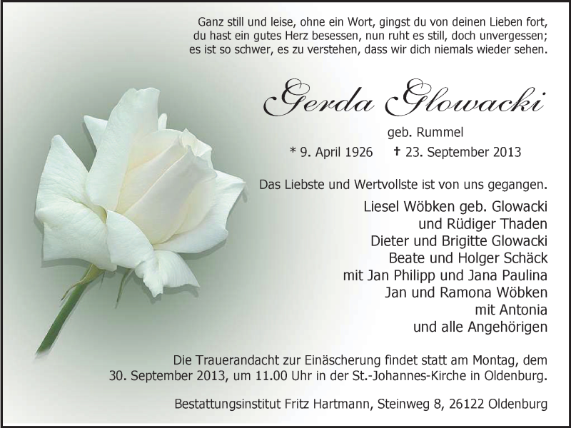 Hier finden Sie alle Traueranzeigen aus der Zeitung, die bisher für Gerda Glowacki erschienen sind. Weitere Traueranzeigen, die in der Zeitung erscheinen, werden hier ebenfalls aufgelistet