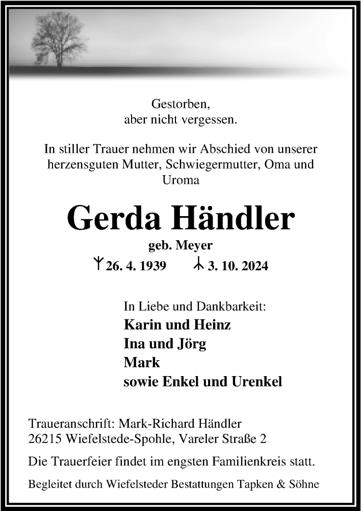 Hier finden Sie alle Traueranzeigen aus der Zeitung, die bisher für Gerda Händler erschienen sind. Weitere Traueranzeigen, die in der Zeitung erscheinen, werden hier ebenfalls aufgelistet