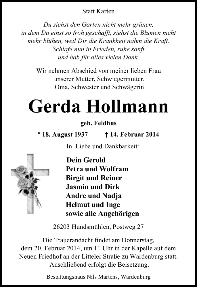 Hier finden Sie alle Traueranzeigen aus der Zeitung, die bisher für Gerda Holmann erschienen sind. Weitere Traueranzeigen, die in der Zeitung erscheinen, werden hier ebenfalls aufgelistet