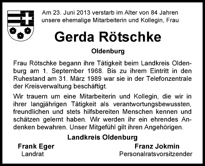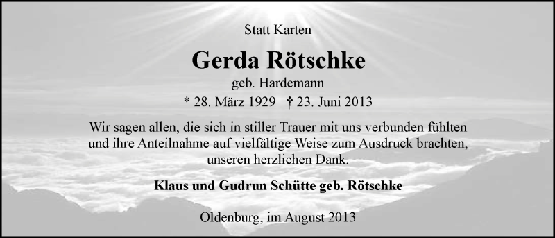 Hier finden Sie alle Traueranzeigen aus der Zeitung, die bisher für Gerda Rötschke erschienen sind. Weitere Traueranzeigen, die in der Zeitung erscheinen, werden hier ebenfalls aufgelistet