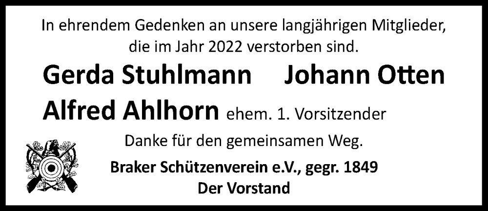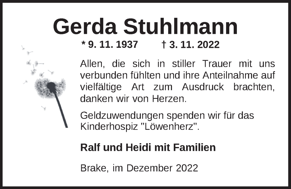 Hier finden Sie alle Traueranzeigen aus der Zeitung, die bisher für Gerda Stuhlmann erschienen sind. Weitere Traueranzeigen, die in der Zeitung erscheinen, werden hier ebenfalls aufgelistet