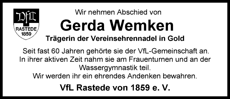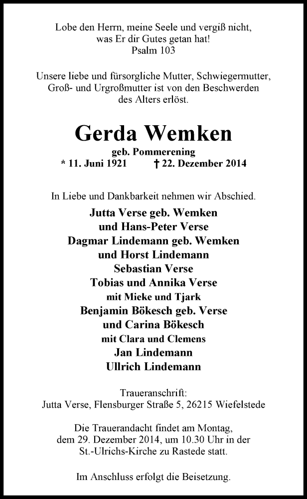 Hier finden Sie alle Traueranzeigen aus der Zeitung, die bisher für Gerda Wemken erschienen sind. Weitere Traueranzeigen, die in der Zeitung erscheinen, werden hier ebenfalls aufgelistet