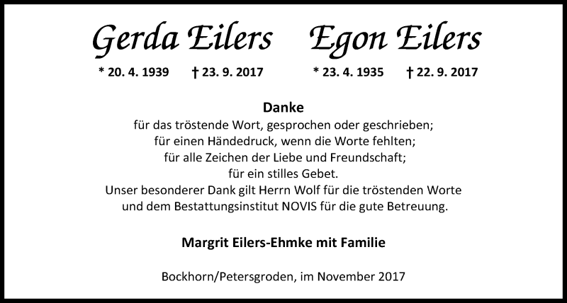 Hier finden Sie alle Traueranzeigen aus der Zeitung, die bisher für Gerda und Egon Eilers erschienen sind. Weitere Traueranzeigen, die in der Zeitung erscheinen, werden hier ebenfalls aufgelistet