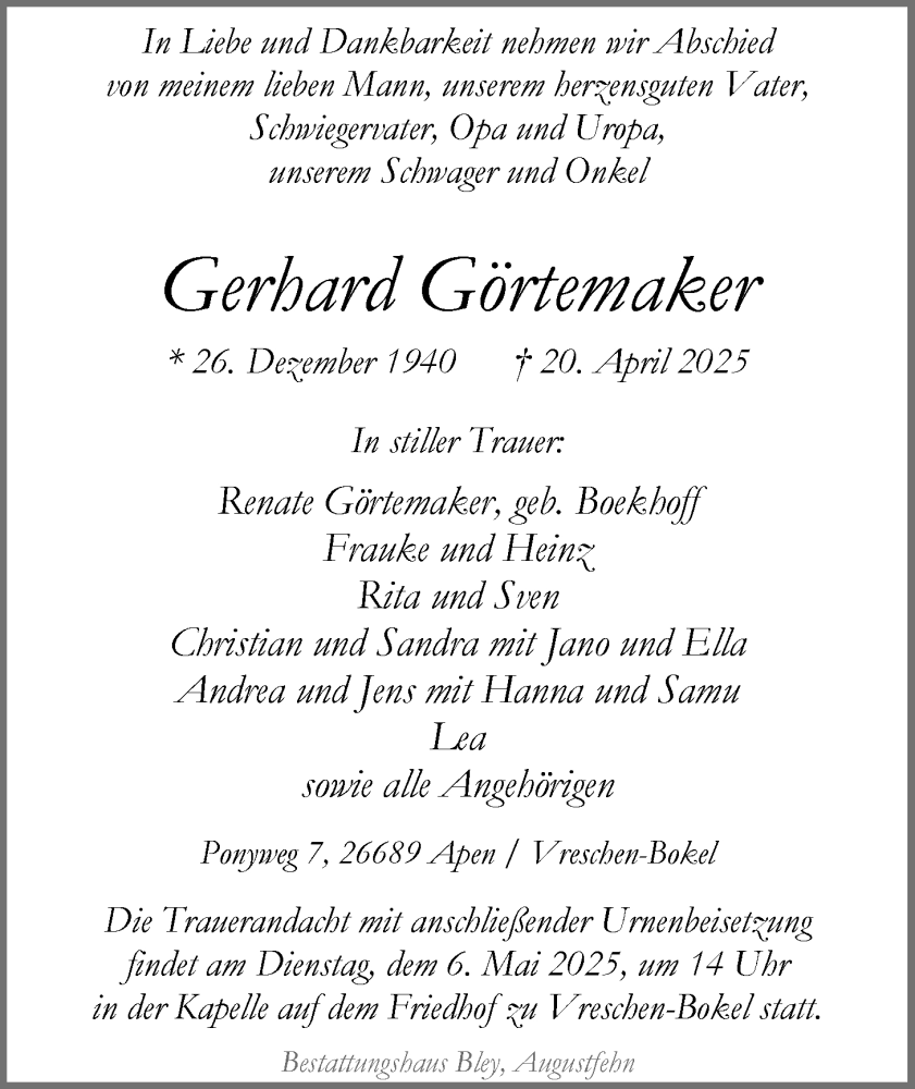 Hier finden Sie alle Traueranzeigen aus der Zeitung, die bisher für Gerhard Görtemaker erschienen sind. Weitere Traueranzeigen, die in der Zeitung erscheinen, werden hier ebenfalls aufgelistet