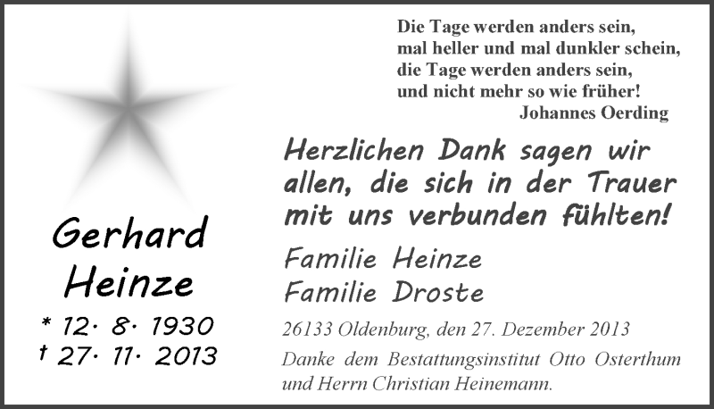 Hier finden Sie alle Traueranzeigen aus der Zeitung, die bisher für Gerhard Heinze erschienen sind. Weitere Traueranzeigen, die in der Zeitung erscheinen, werden hier ebenfalls aufgelistet