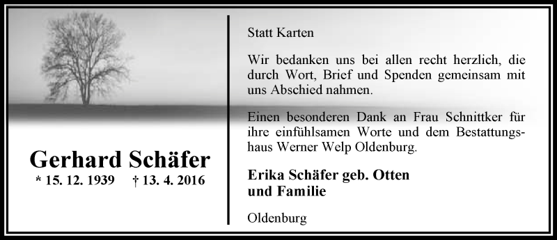 Hier finden Sie alle Traueranzeigen aus der Zeitung, die bisher für Gerhard Schäfer erschienen sind. Weitere Traueranzeigen, die in der Zeitung erscheinen, werden hier ebenfalls aufgelistet