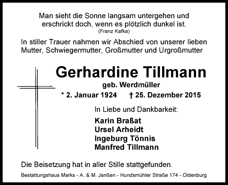Hier finden Sie alle Traueranzeigen aus der Zeitung, die bisher für Gerhardine Tillmann erschienen sind. Weitere Traueranzeigen, die in der Zeitung erscheinen, werden hier ebenfalls aufgelistet