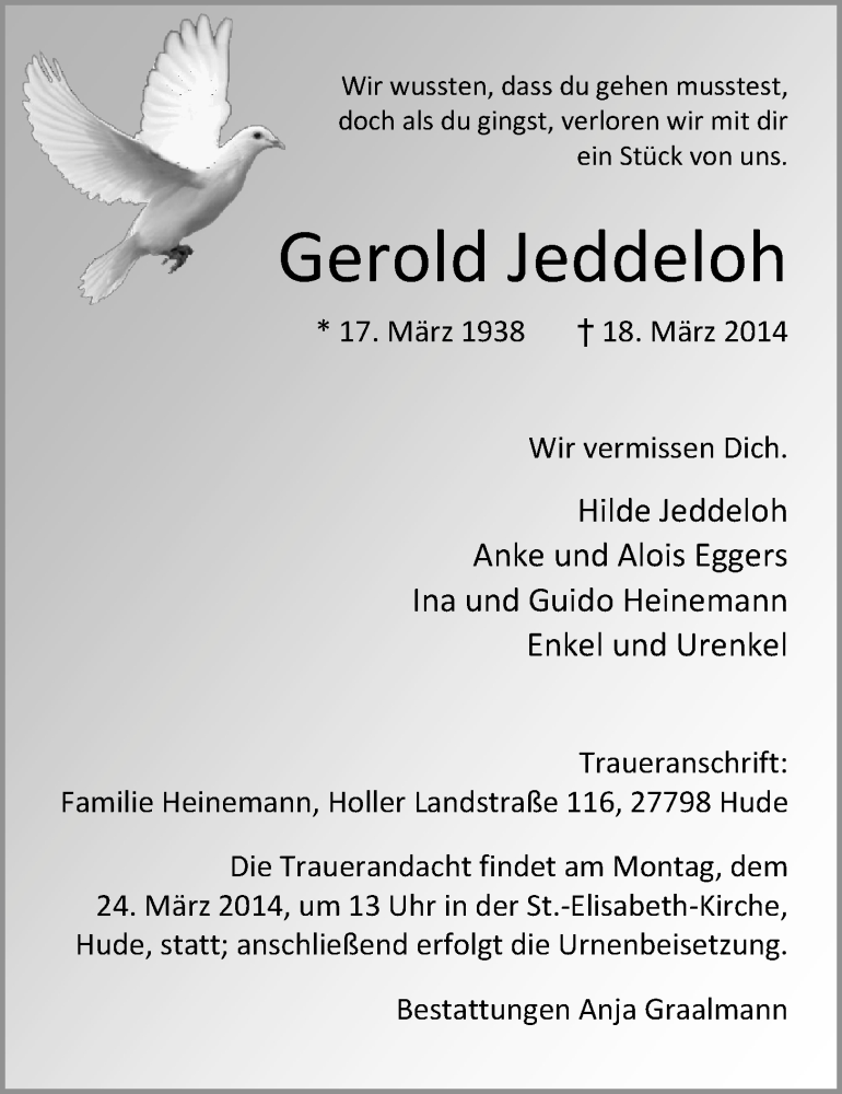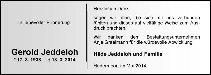 Hier finden Sie alle Traueranzeigen aus der Zeitung, die bisher für Gerold Jeddeloh erschienen sind. Weitere Traueranzeigen, die in der Zeitung erscheinen, werden hier ebenfalls aufgelistet