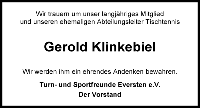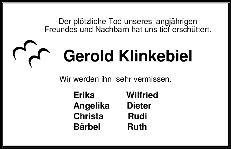 Hier finden Sie alle Traueranzeigen aus der Zeitung, die bisher für Gerold Klinkebiel erschienen sind. Weitere Traueranzeigen, die in der Zeitung erscheinen, werden hier ebenfalls aufgelistet