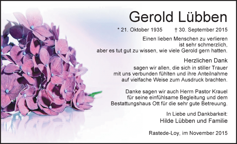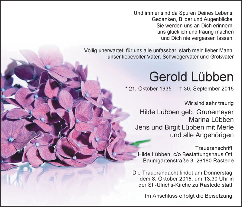 Hier finden Sie alle Traueranzeigen aus der Zeitung, die bisher für Gerold Lübben erschienen sind. Weitere Traueranzeigen, die in der Zeitung erscheinen, werden hier ebenfalls aufgelistet