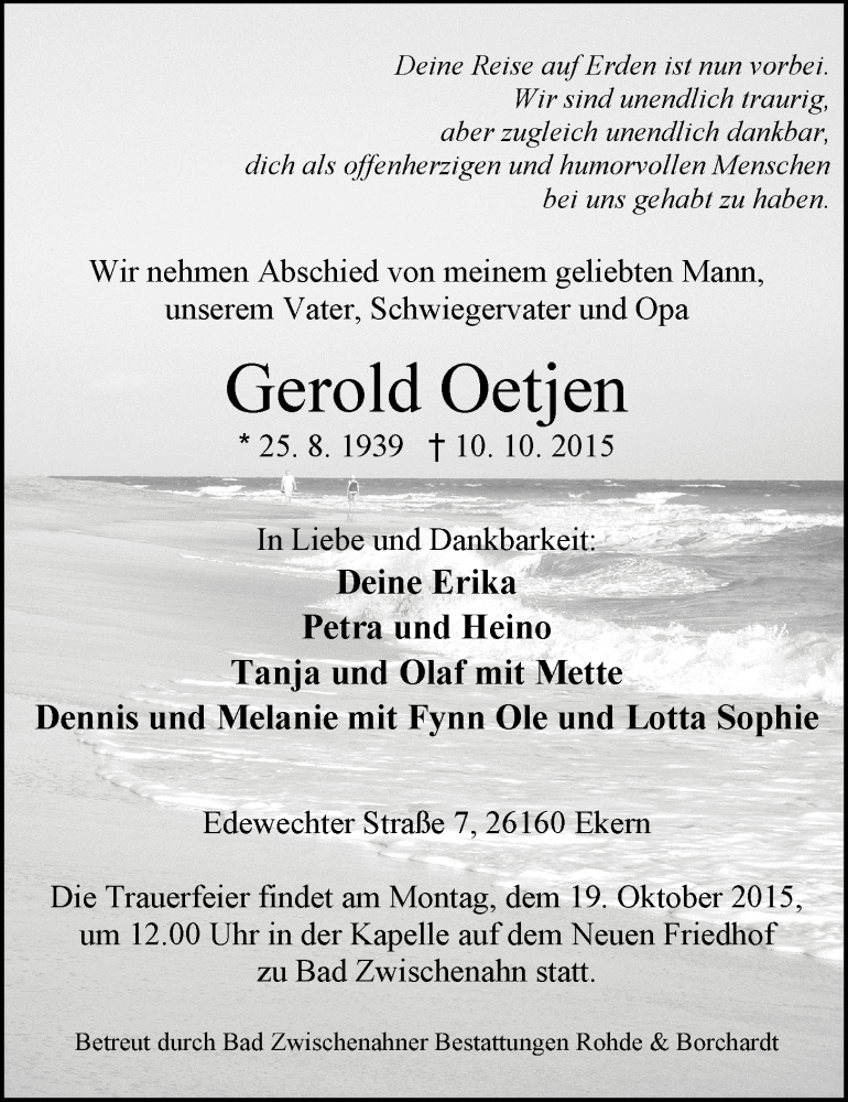 Hier finden Sie alle Traueranzeigen aus der Zeitung, die bisher für Gerold Oetjen erschienen sind. Weitere Traueranzeigen, die in der Zeitung erscheinen, werden hier ebenfalls aufgelistet
