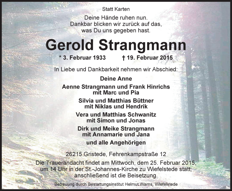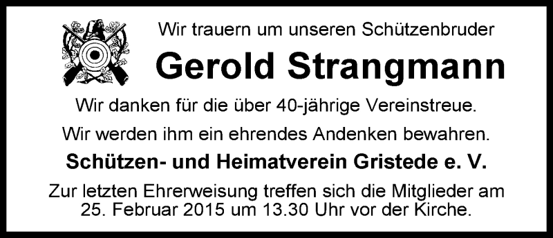 Hier finden Sie alle Traueranzeigen aus der Zeitung, die bisher für Gerold Strangmann erschienen sind. Weitere Traueranzeigen, die in der Zeitung erscheinen, werden hier ebenfalls aufgelistet