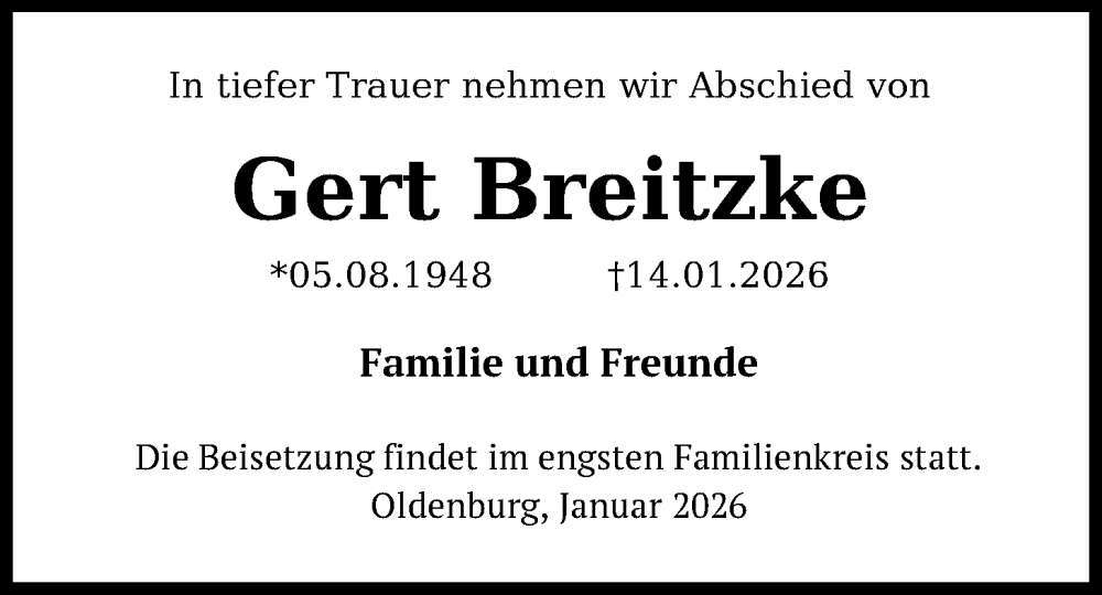 Hier finden Sie alle Traueranzeigen aus der Zeitung, die bisher für Gert Breitzke erschienen sind. Weitere Traueranzeigen, die in der Zeitung erscheinen, werden hier ebenfalls aufgelistet